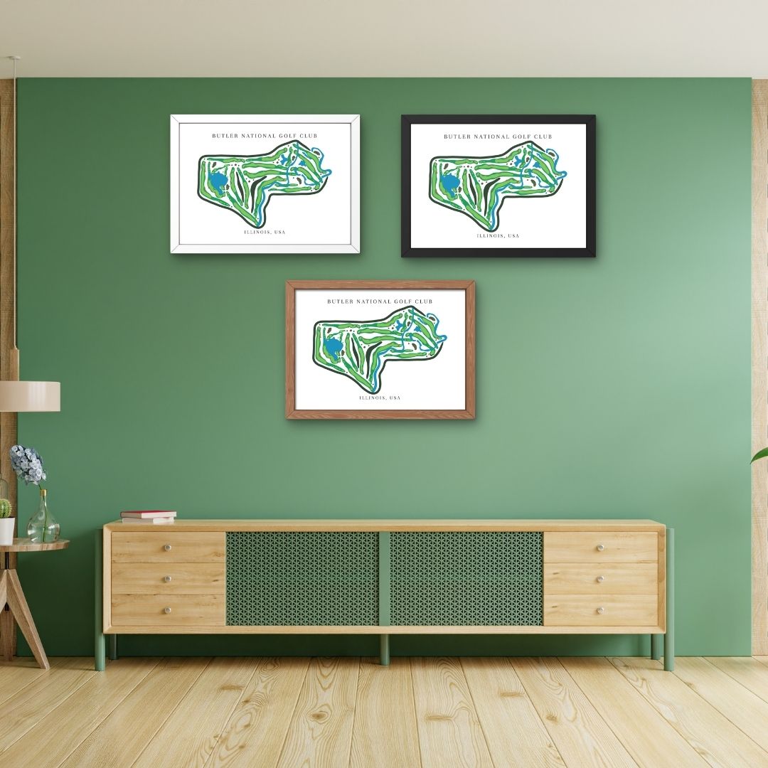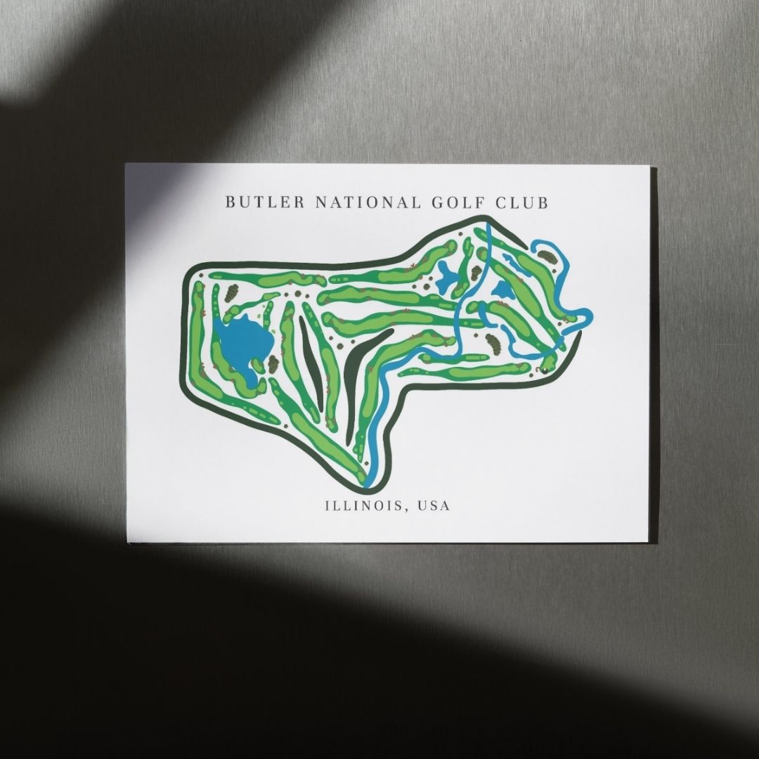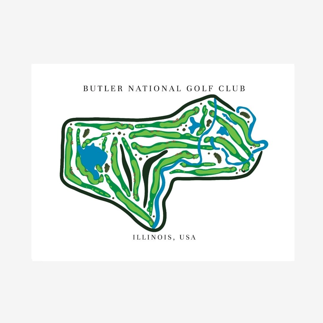 Celebrate the championship prestige of Butler National Golf Club Golf Course Prints, Illinois, Golf Map Artwork with this detailed golf course map print. Located in Illinois, stands among the most exclusive and challenging private clubs in American golf. Its strategic layout and water-lined holes inspire this refined golf map artwork, which captures every hole with crisp detail. As a result, it stands out among premium framed golf course prints and makes a striking gift for golfers.