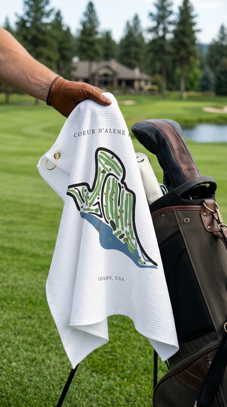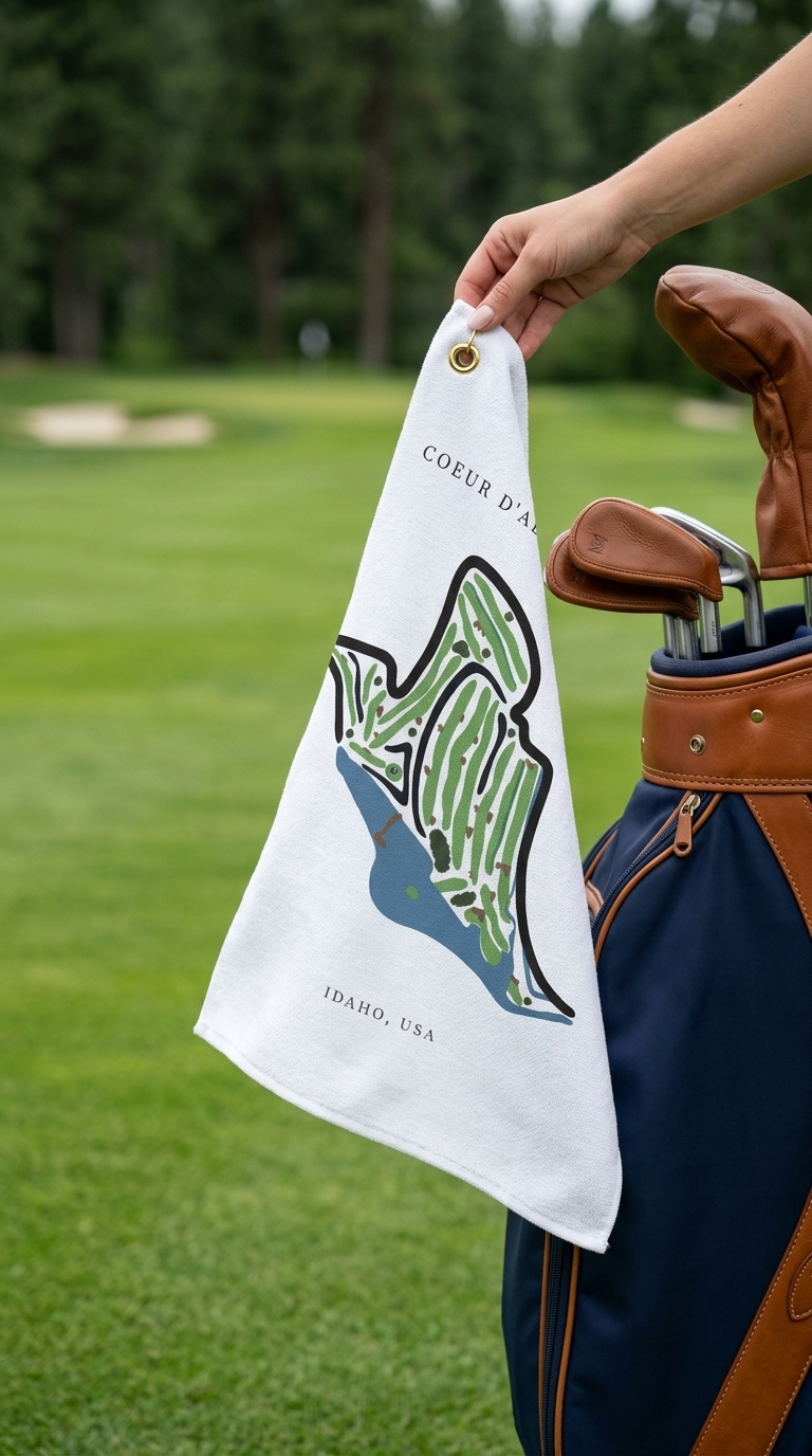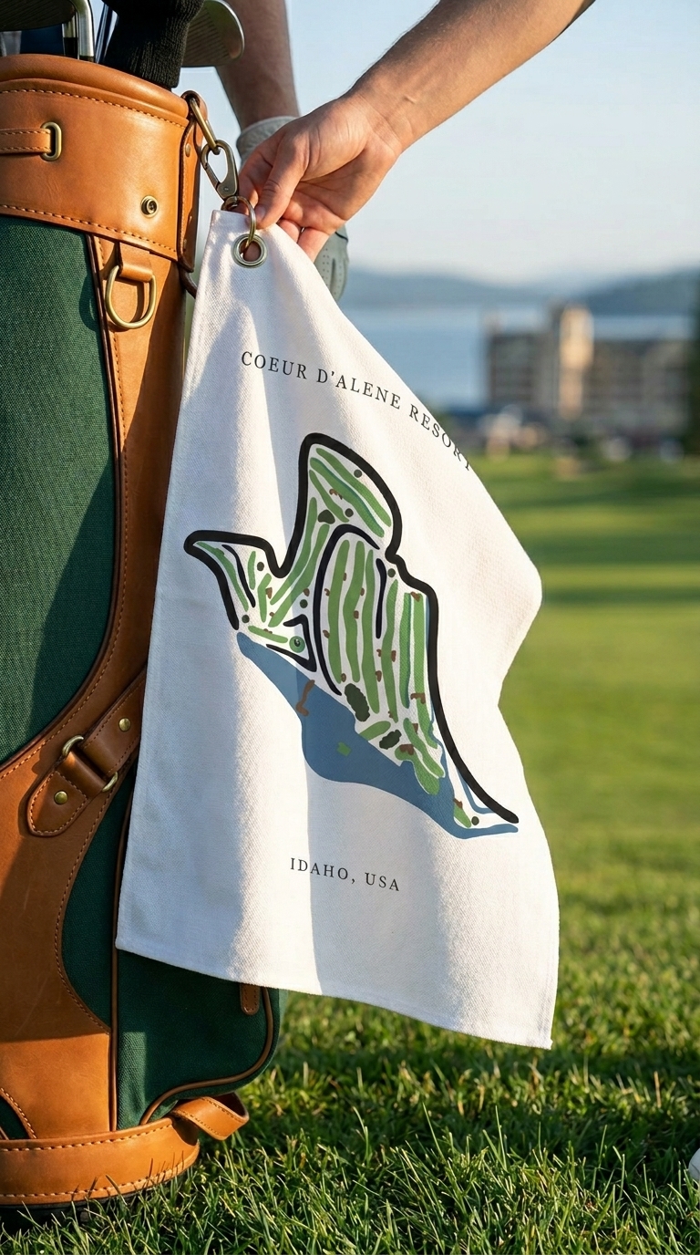 Shop the Coeur d’Alene Resort Golf Course Golf Course Print Towel, inspired by one of Idaho’s most scenic waterfront golf courses. Known for its lake views, lush fairways, and unique design, this course offers a memorable playing experience in a natural setting.