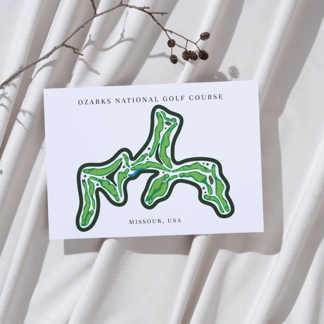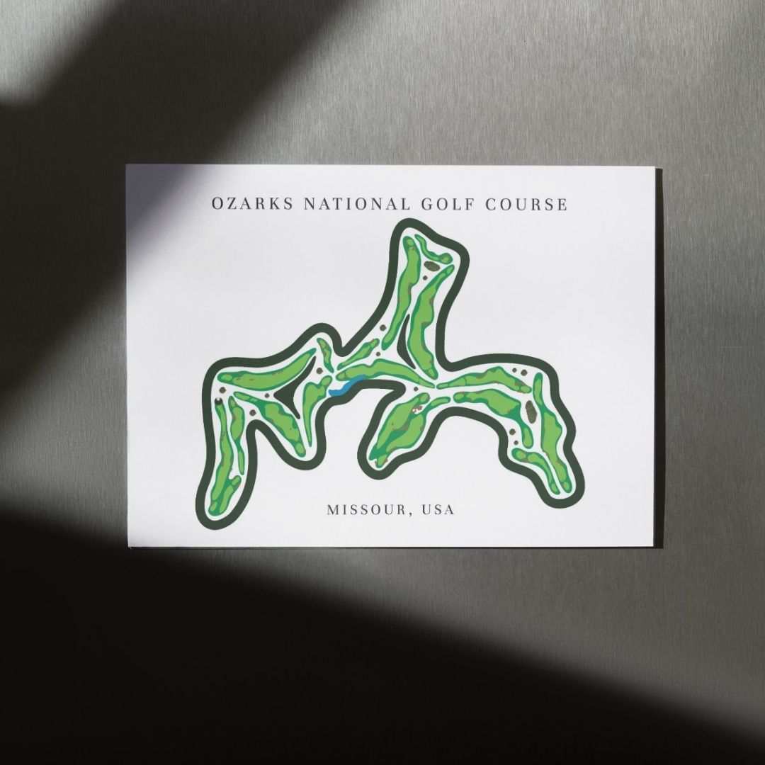 Celebrate the dramatic beauty of Ozarks National Golf Course Prints, Missouri, Golf Map Artwork with this detailed golf course map print. Located in Missouri, Ozarks National Golf Course showcases a rugged, links-inspired layout carved through the Ozark Mountains. This refined golf map artwork captures every hole with sharp precision. As a result, it stands out among premium framed golf course prints and makes a striking gift for golfers.