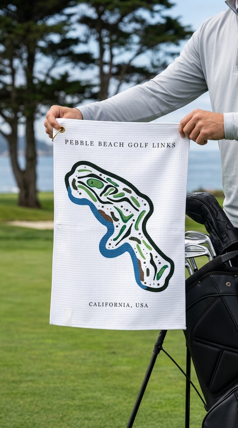 Celebrate the beauty of Pebble Beach Golf Course Print Towels, inspired by one of California’s most iconic golf destinations. Pebble Beach is known for dramatic coastal holes, pristine fairways, and world-famous ocean views. This high-quality microfiber towel features a detailed, full-color print of the course layout, highlighting signature holes and the breathtaking scenery that makes Pebble Beach unforgettable. It serves as both a practical on-course accessory and a collectible keepsake for golfers who value craftsmanship and design.