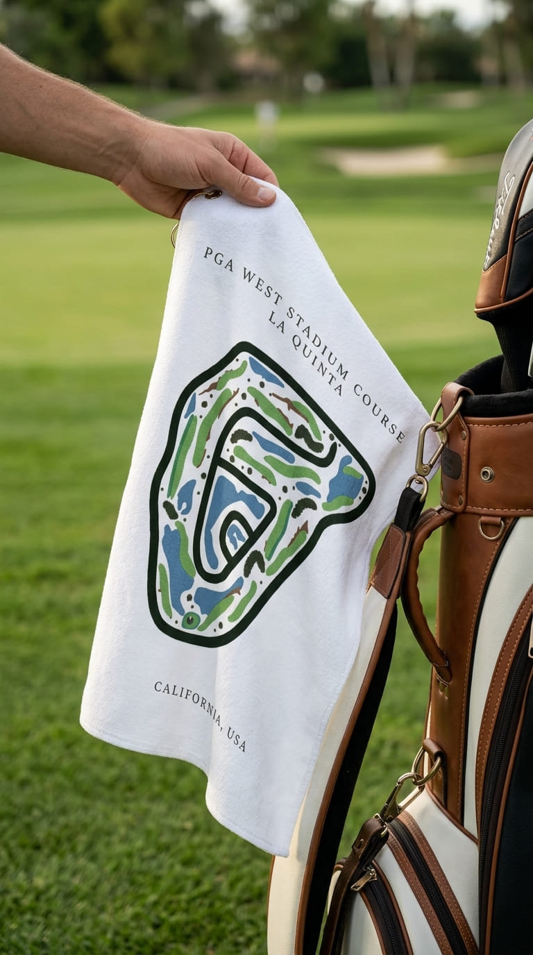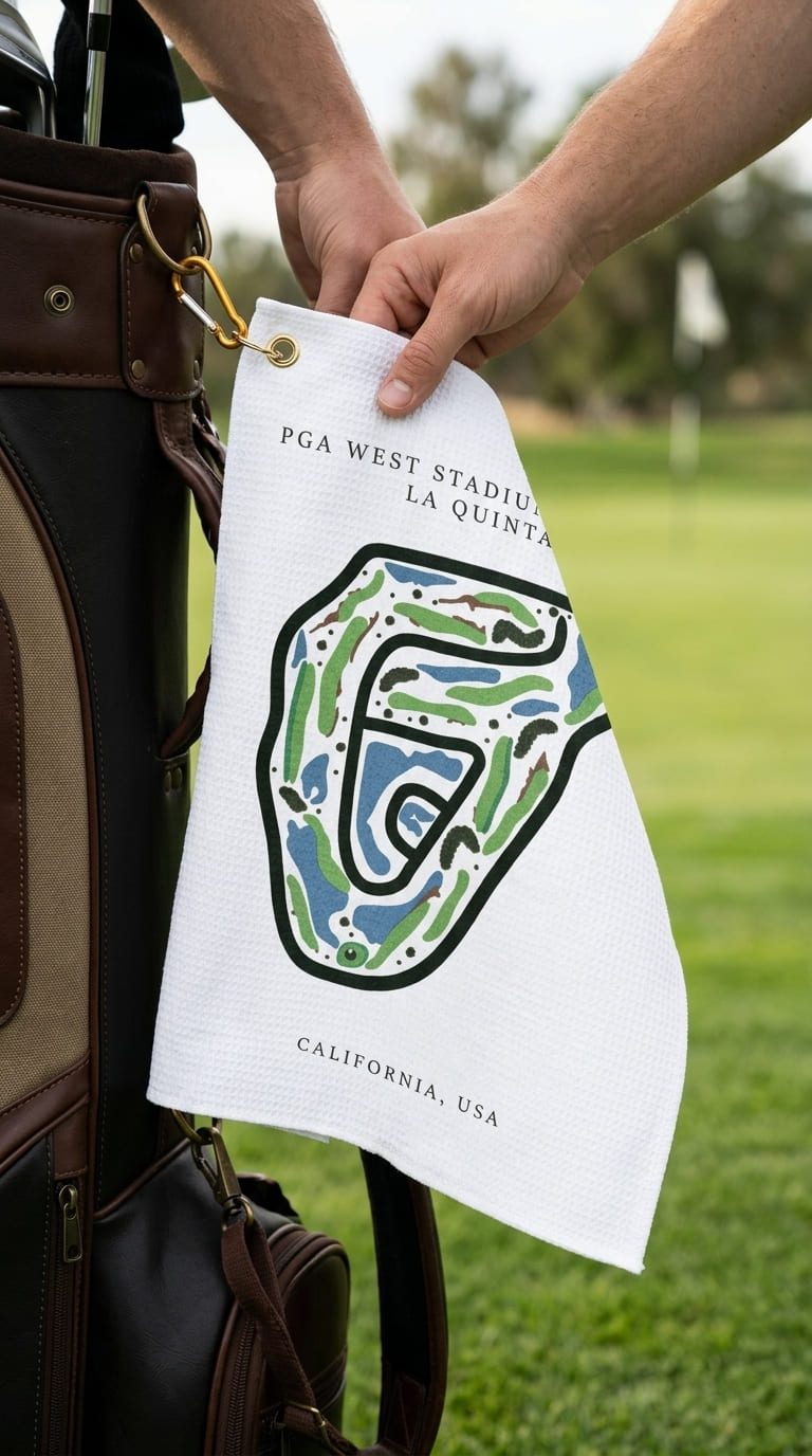 Shop the PGA West Stadium Course Golf Course Print Towel, inspired by the legendary course in La Quinta, California — one of the most iconic destinations in Palm Springs golf. Known for its challenging layout, dramatic bunkers, and championship pedigree, this premium microfiber golf towel captures the essence of the Stadium Course, including its signature holes, rolling fairways, and desert landscaping. Designed for golfers who value performance, style, and tradition, it’s both a functional accessory and a collectible keepsake.