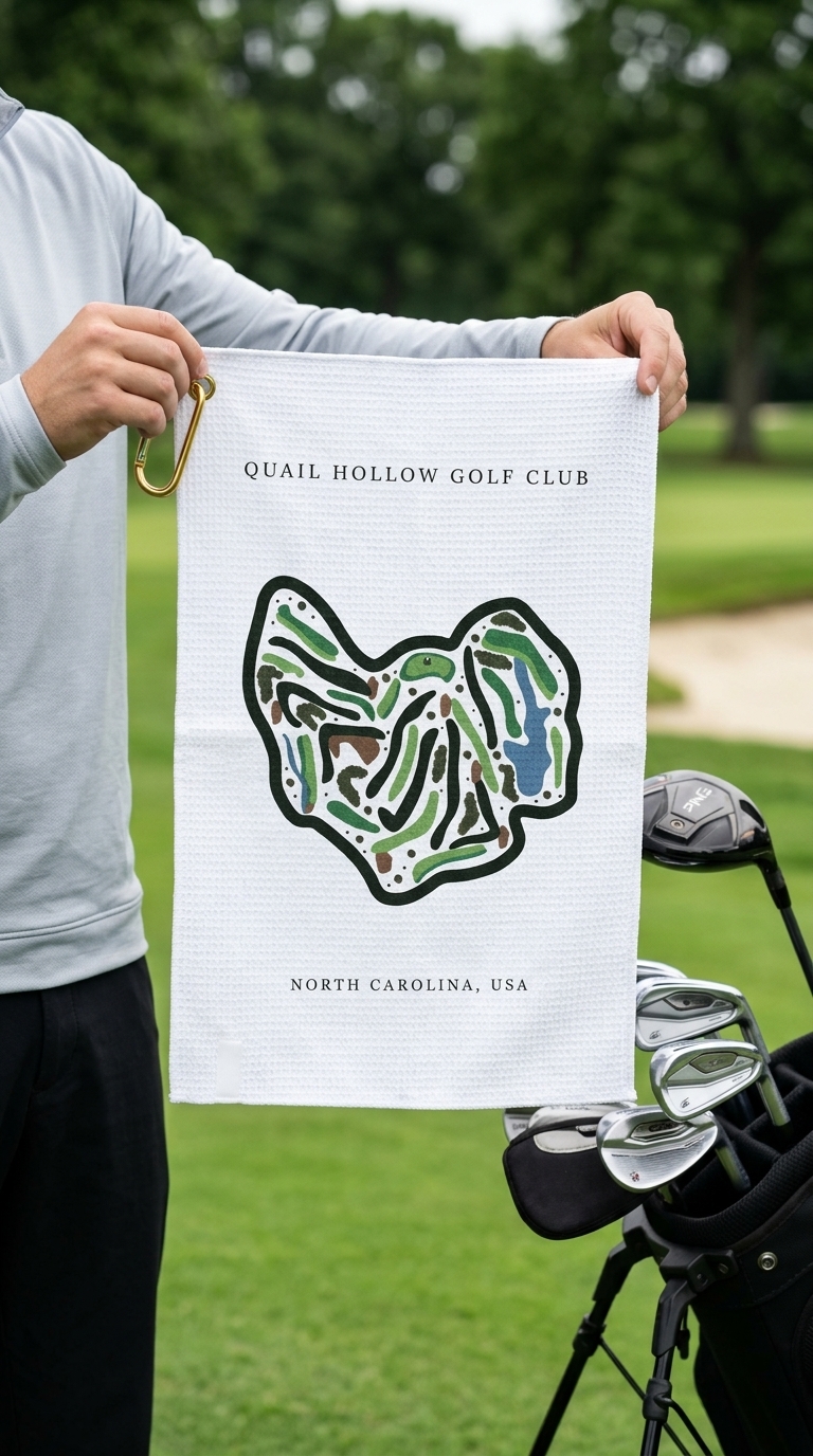 Shop the Quail Hollow Golf Club Golf Towels, inspired by the championship course in Charlotte, North Carolina. The club is known for tree-lined fairways, fast greens, and a challenging layout. It has also hosted major PGA Tour events, including the Wells Fargo Championship. This premium microfiber towel features a vivid, full-color course layout. It highlights signature holes, rolling terrain, and the scenic Carolina landscape. As a result, it becomes a perfect keepsake for golfers who value detail and design.
