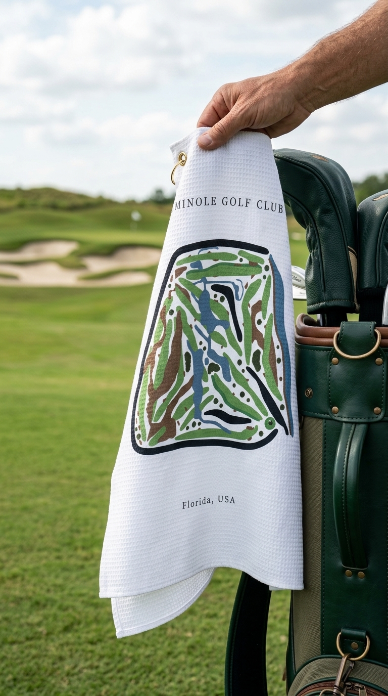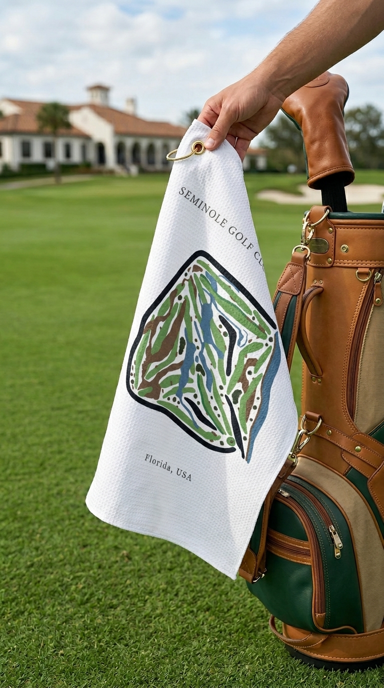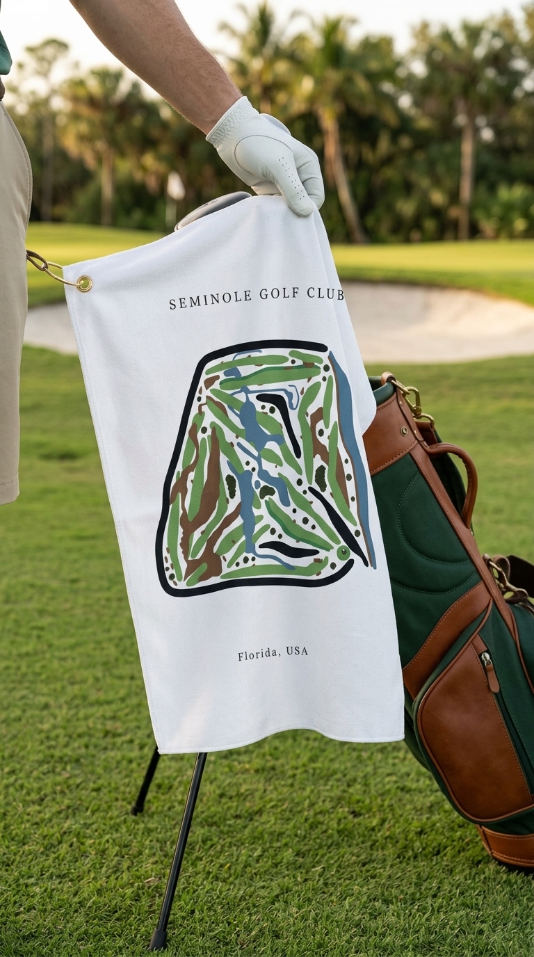 Bring the prestige of Seminole Golf Club to your game with the Seminole Golf Club Course Print Towel—a perfect combination of performance, style, and golf-inspired design.