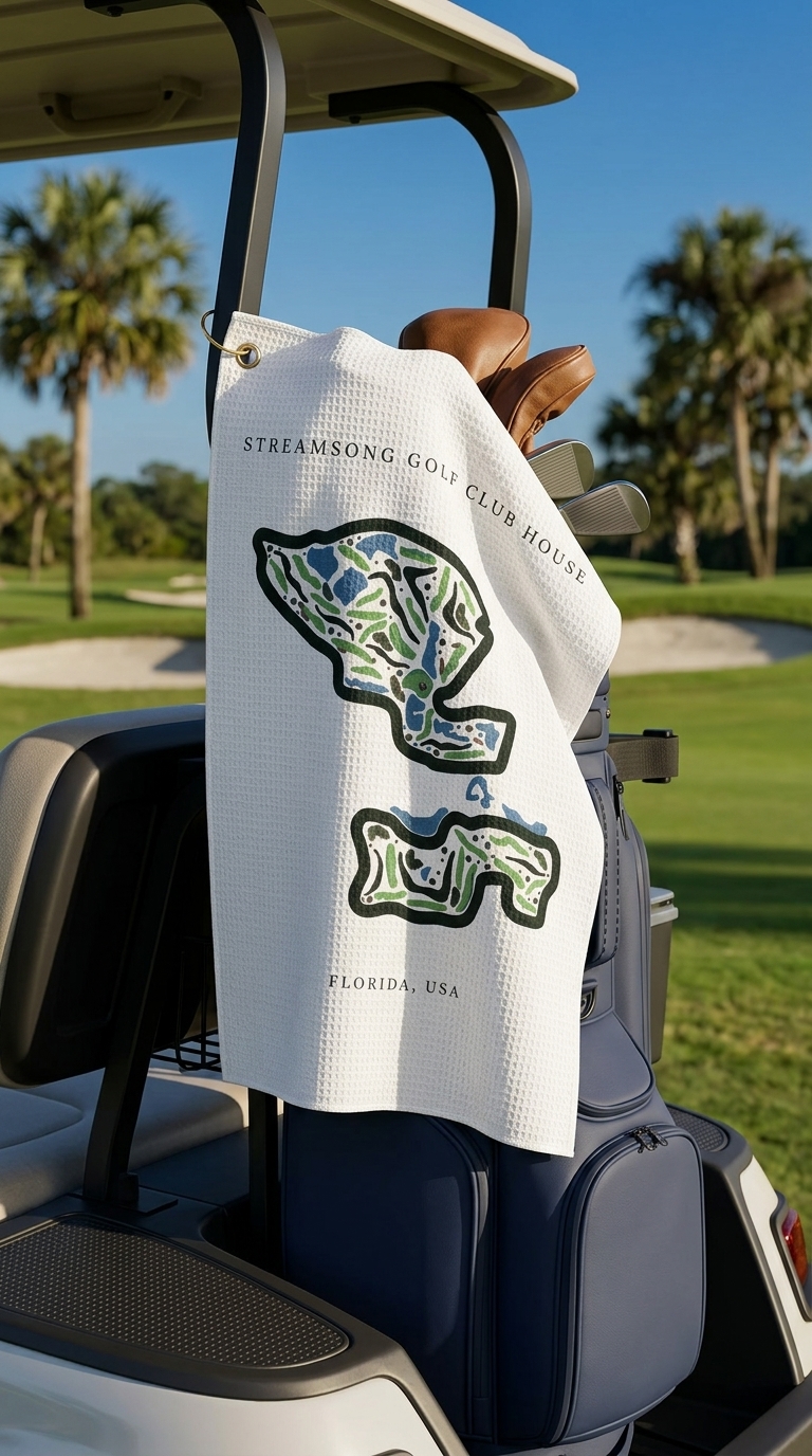 Shop the Streamsong Golf & Club house Golf Course Print Towel, inspired by one of Florida’s most unique and modern golf destinations. Streamsong is known for its dramatic landscape, firm playing conditions, and world-class course design. It offers a pure golf experience focused on strategy, shot-making, and natural terrain.