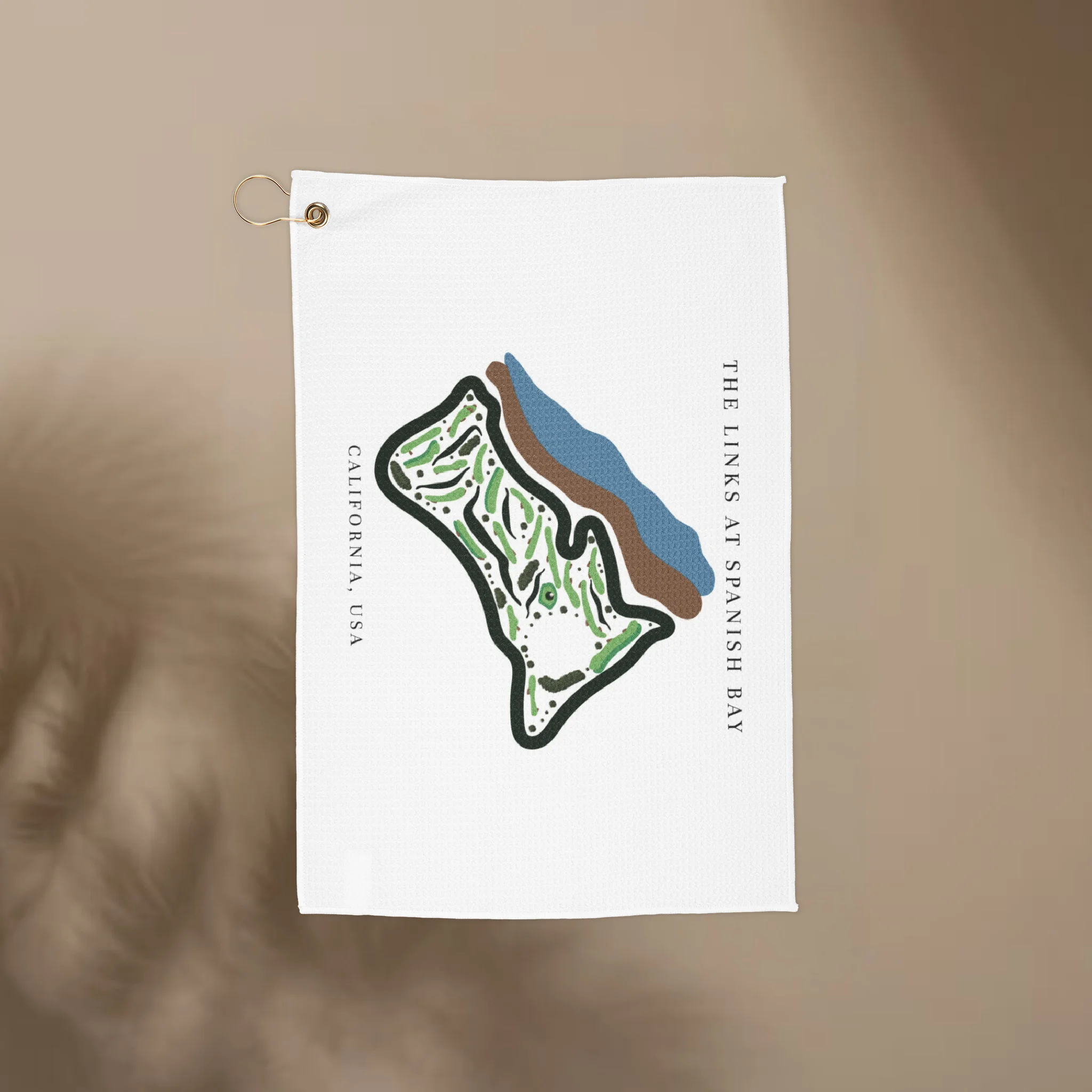 Shop the Links at Spanish Bay Golf Course Print Towel, inspired by the stunning coastal course in Pebble Beach, California. The layout is known for ocean views, rugged dunes, and memorable holes. This premium microfiber towel features the full course map with signature fairways and natural scenery. It works as a functional golf accessory and a collectible piece for anyone who loves this iconic course.