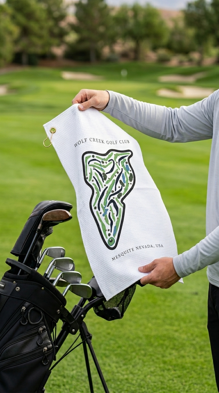 Shop the Wolf Creek Golf Club Golf Course Print Towel, inspired by one of Nevada’s most dramatic and visually striking golf courses. Located in Mesquite, Wolf Creek is known for its elevation changes, bold fairways, and unique desert landscape. It delivers a challenging and unforgettable playing experience.